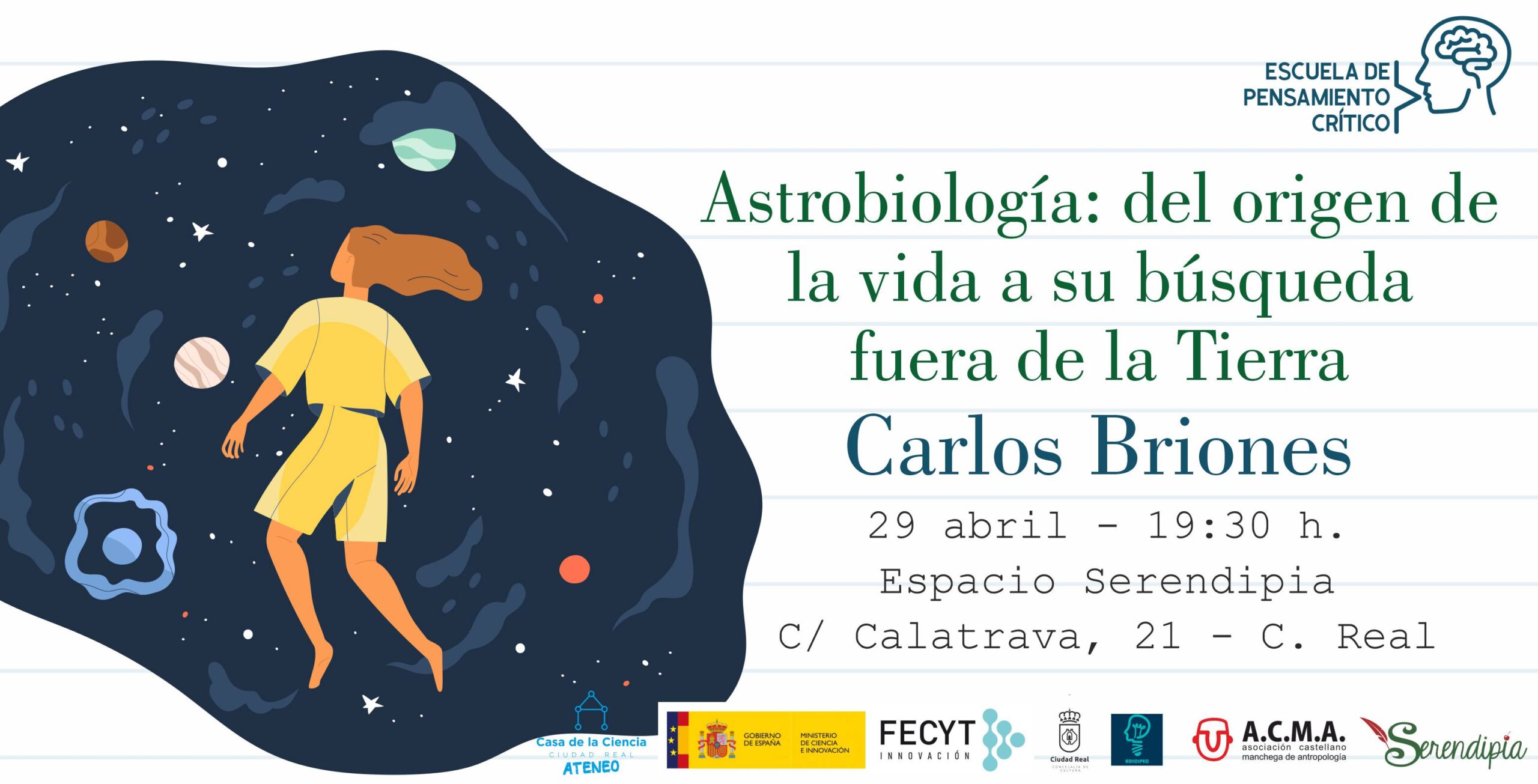 El miércoles, 29 de abril, a las 19:30 h., en el Espacio Serendipia de Ciudad Real (Calle Calatrava,21), tendrá lugar la Escuela de Pensamiento Crítico, con el Tema 28: “Astrobiología: del origen de la vida a su búsqueda fuera de la Tierra”, impartido por Carlos Briones. (Departamento de Evolución Molecular. Centro de Astrobiología (CSIC-INTA, asociado al NASA Astrobiology Program))